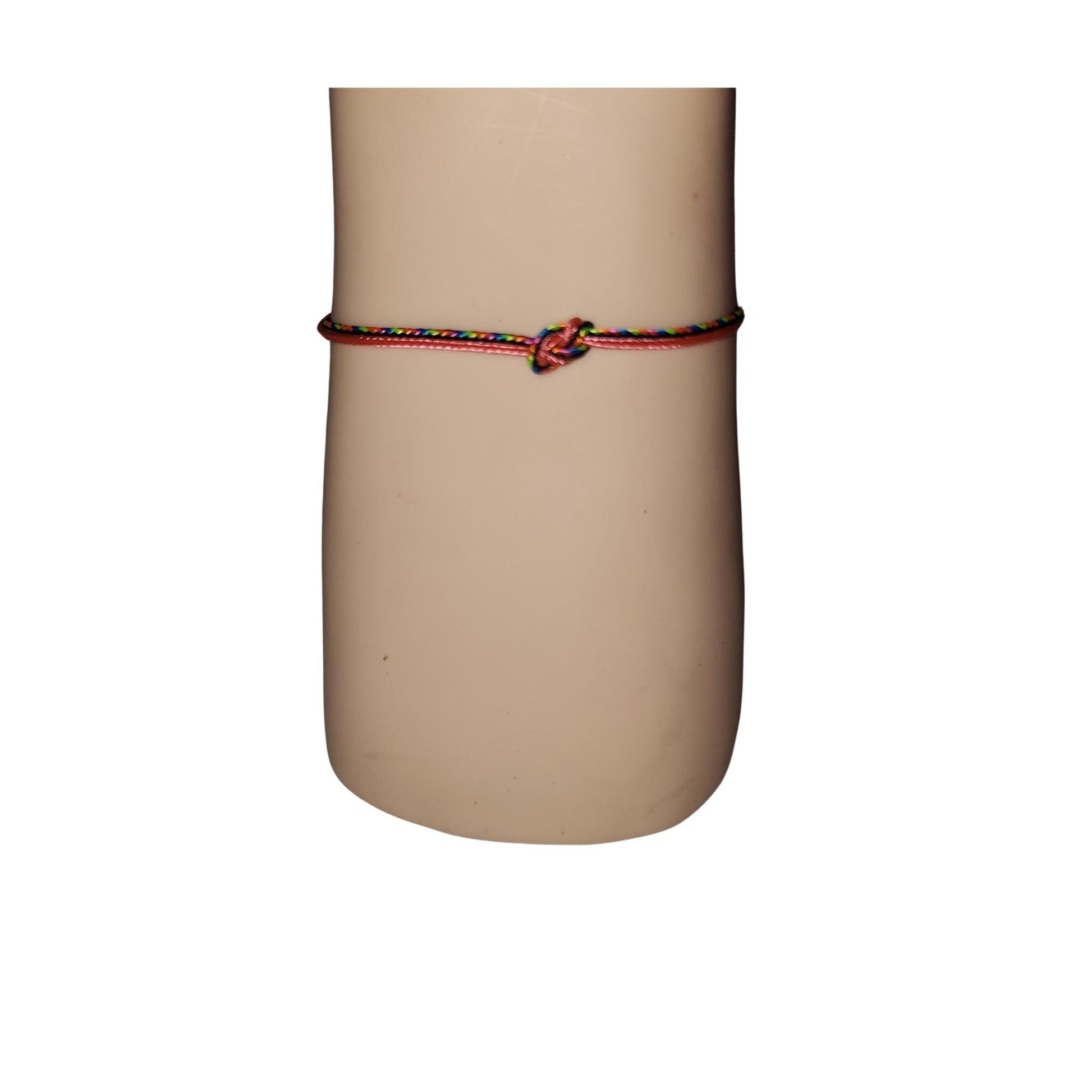 Thin, adjustable micro paracord bracelets in pink with rainbow accents.