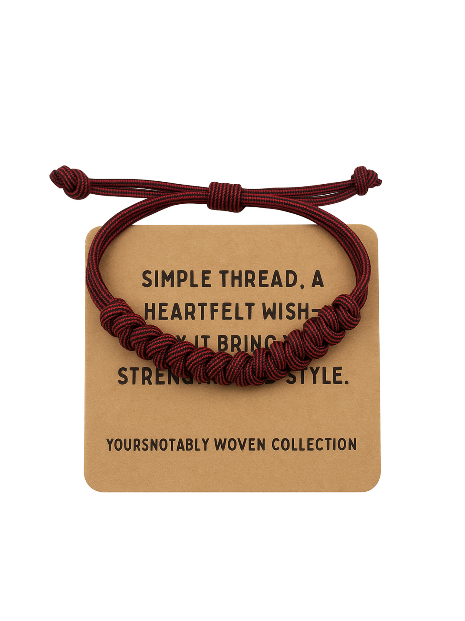 Handcrafted with care, this dark red and black paracord bracelet is part of the YoursNotably Woven Collection. Each bracelet comes with a minimalist note card with the message: “Simple thread, a heartfelt wish—may it bring you strength and style.” The combination of durable paracord and meaningful presentation makes this bracelet more than just an accessory — it’s a thoughtful gift ready to wear or share.