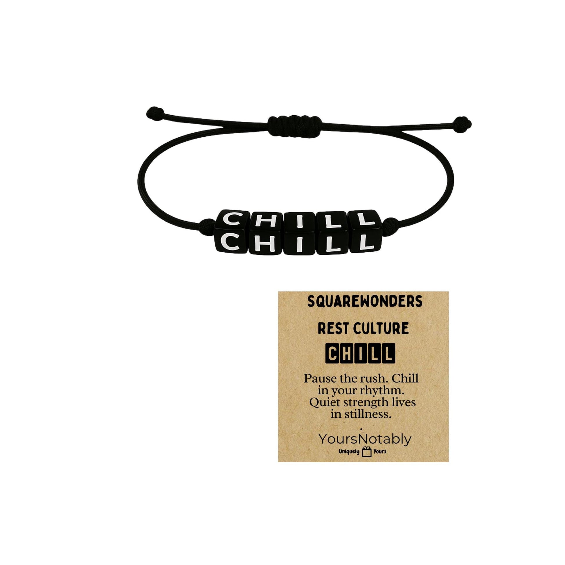 From the SquareWonders Rest Culture Collection by YoursNotably A small wearable reminder to slow your pace and honor your calm. This minimalist bracelet features black acrylic cube beads that spell out CHILL, strung on a durable, adjustable black paracord. It’s lightweight, easy to wear, and designed to flex with your day...whether you’re on the go or settling into stillness.
